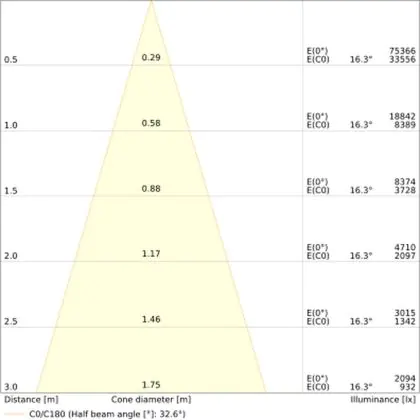 Der Abstrahlwinkel bezeichnet den Winkel, in dem das Licht aus der Lichtquelle ausgestrahlt wird. Er wird in Grad (D) angegeben. Je geringer die Gradzahl des Abstrahlwinkels ist, desto kleiner ist auch der Durchmesser des Lichtkegels, den die Lichtquelle produziert. Beispiel: Wird eine Lampe mit einem Abstrahlwinkel von 60 Grad an der Decke (2,5 m Höhe) angebracht, erzeugt sie einen Lichtkegel von 2,9 Metern Durchmesser. Hat die Lampe hingegen einen Abstrahlwinkel von 120 Grad, beträgt der Lichtkegel 8,7 Meter im Durchmesser. |