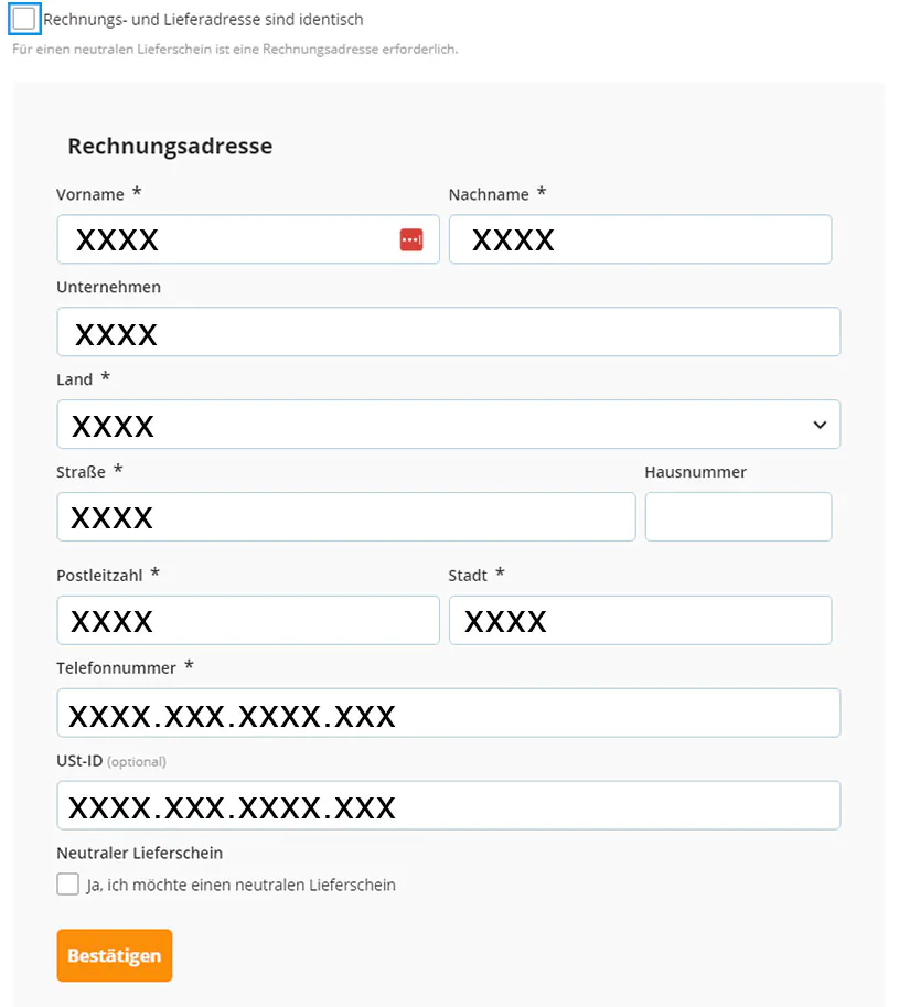 Entfernen Sie das Häkchen bei "Rechnungs- und Lieferadresse sind identisch."